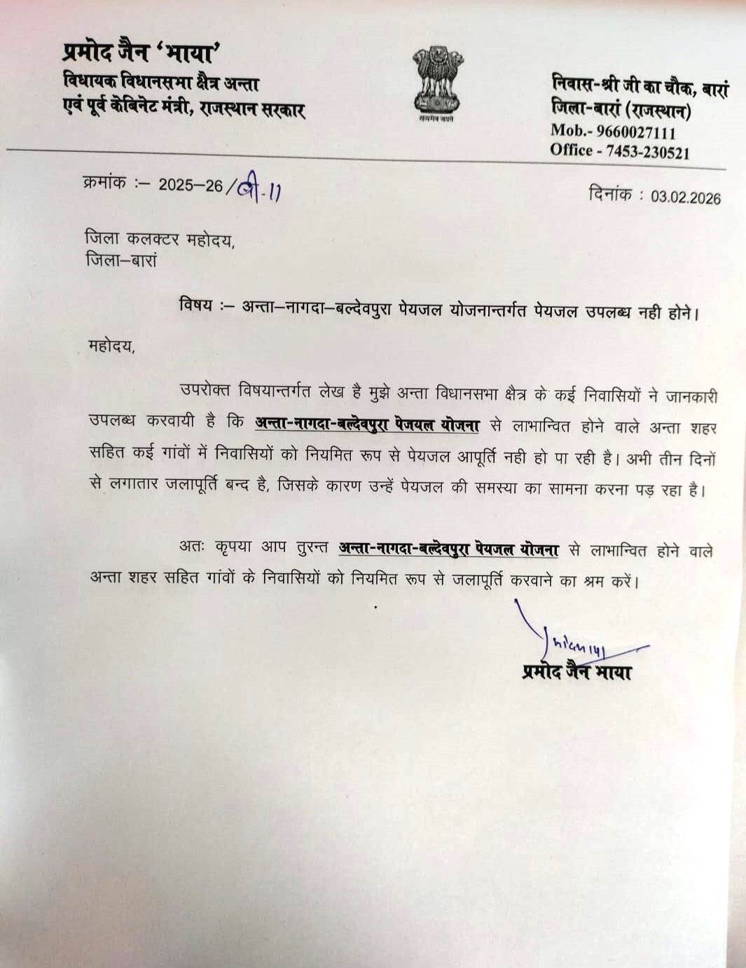अन्ता-नागदा-बल्देवपुरा पेयजल योजनान्तर्गत लाभान्वित होने वाले निवासियों को नियमित जलापूर्ति को लेकर अन्ता विधायक प्रमोद जैन भाया ने जिला कलक्टर बारां को पत्र लिखा